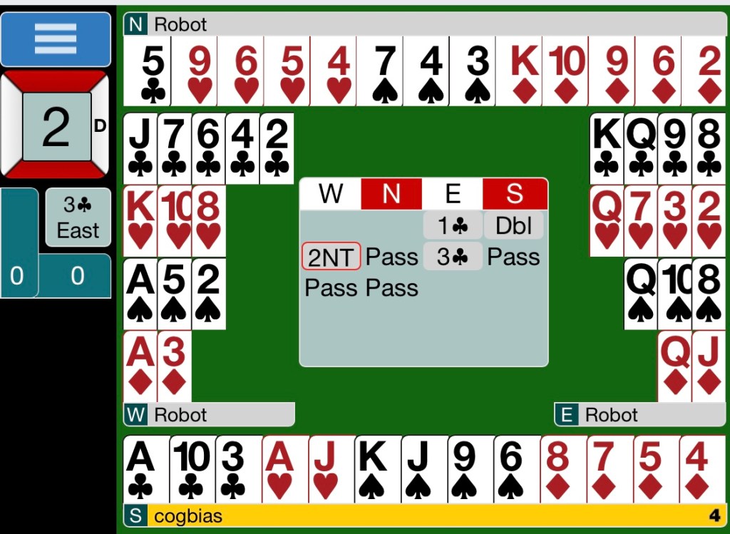 Now let us describe Jacoby 2NT. Bid 2NT on a partner’s level 1 Major (1!S or 1!H). It signals FIT in opening Major with 13+ points in responder’s hand.